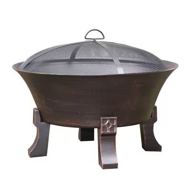 Enhance your outdoor living space with this 26-inch Outdoor Cast Iron Fire Pit with Mesh Cover and Poker in Bronze. Designed with a deep bowl for loading more wood, it offers a wood grate, mesh cover and fire poker. An antique bronze finish adds decorative charm, and cast iron construction allows lasting use.